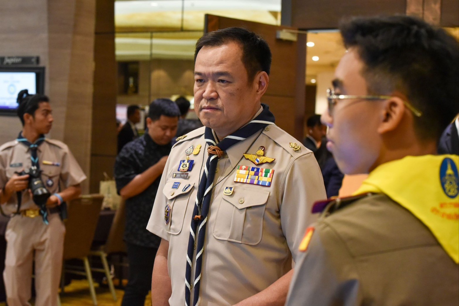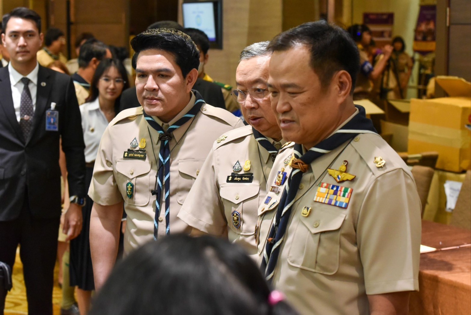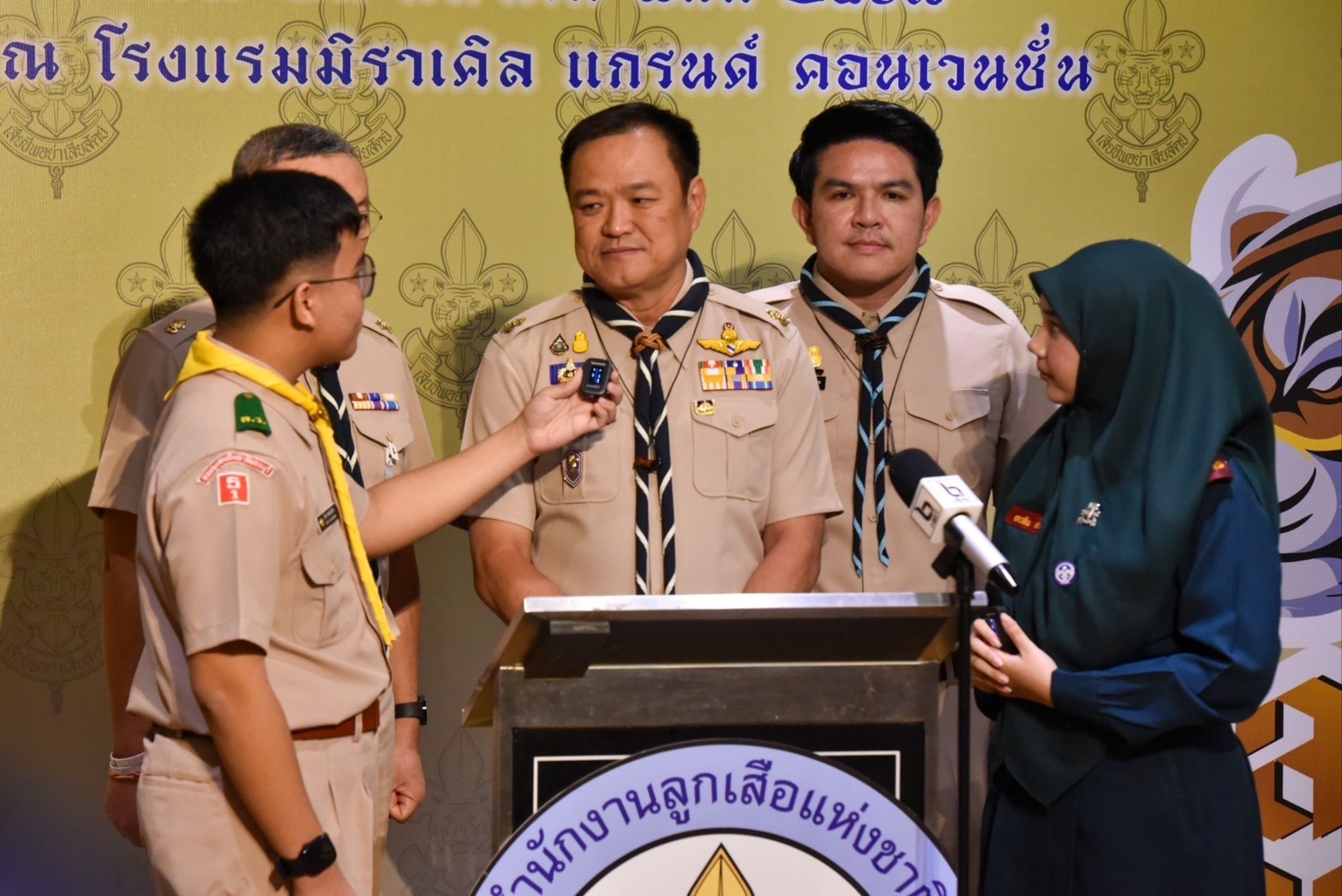 โดยมี พล.ต.อ.เพิ่มพูน ชิดชอบรัฐมนตรีว่าการกระทรวงศึกษาธิการ ในฐานะประธานกรรมการบริหารลูกเสือแห่งชาติ นายสุรศักดิ์ พันธ์เจริญวรกุล รัฐมนตรีช่วยว่าการกระทรวงศึกษาธิการ นายสุเทพ แก่งสันเทียะ ปลัดกระทรวงศึกษาธิการ นายวรัท พฤกษาทวีกุล เลขาธิการสำนักงานลูกเสือแห่งชาติ คณะกรรมการบริหารลูกเสือแห่งชาติ กรรมการผู้ทรงคุณวุฒิของสภาลูกเสือไทย และผู้แทนองค์กรภาคีเครือข่าย จำนวน 250 คน ให้การต้อนรับ ณ โรงแรมมิราเคิล แกรนด์ คอนเวนชั่น กรุงเทพฯ