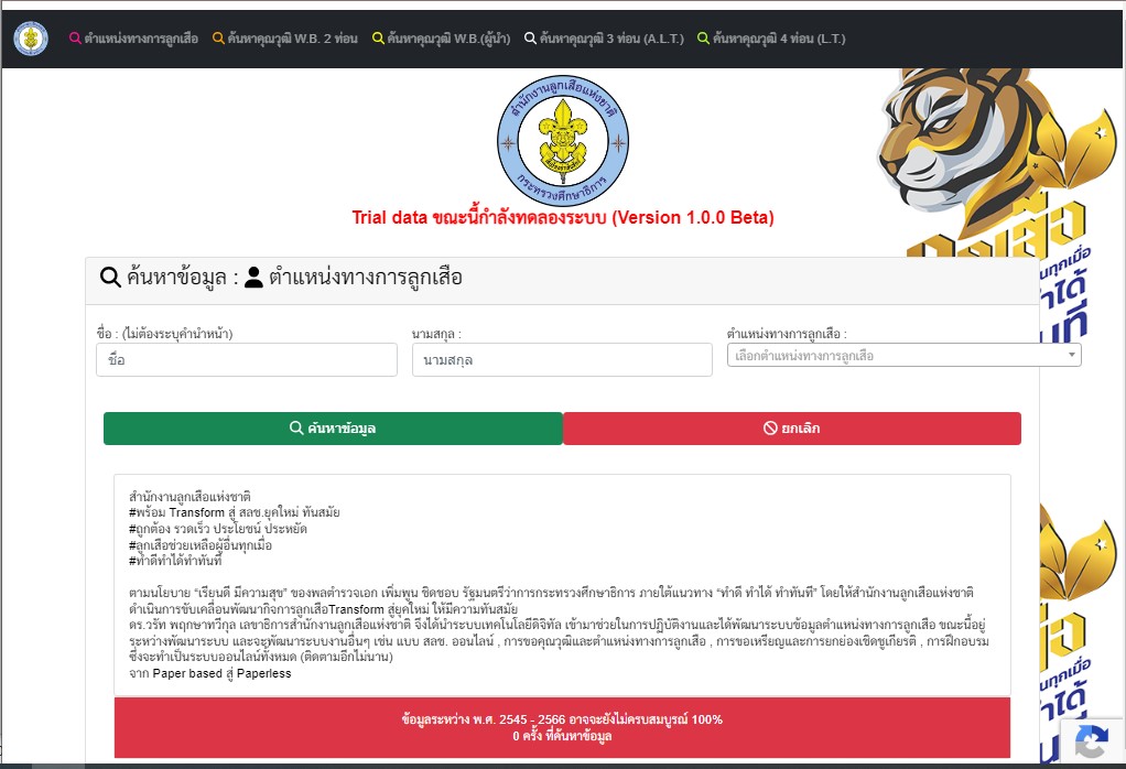 ทั้งนี้ ข้อมูลที่ปรากฎในระบบ เป็นข้อมูลที่จัดเก็บ รวบรวมระหว่างปี พ.ศ. 2545 - 2566 และพัฒนาขึ้นโดยสำนักงานลูกเสือแห่งชาติ ซึ่งยังไม่ครบสมบูรณ์ 100% สำนักงานลูกเสือแห่งชาติ จึงเปิดระบบให้ทดสอบการใช้งาน