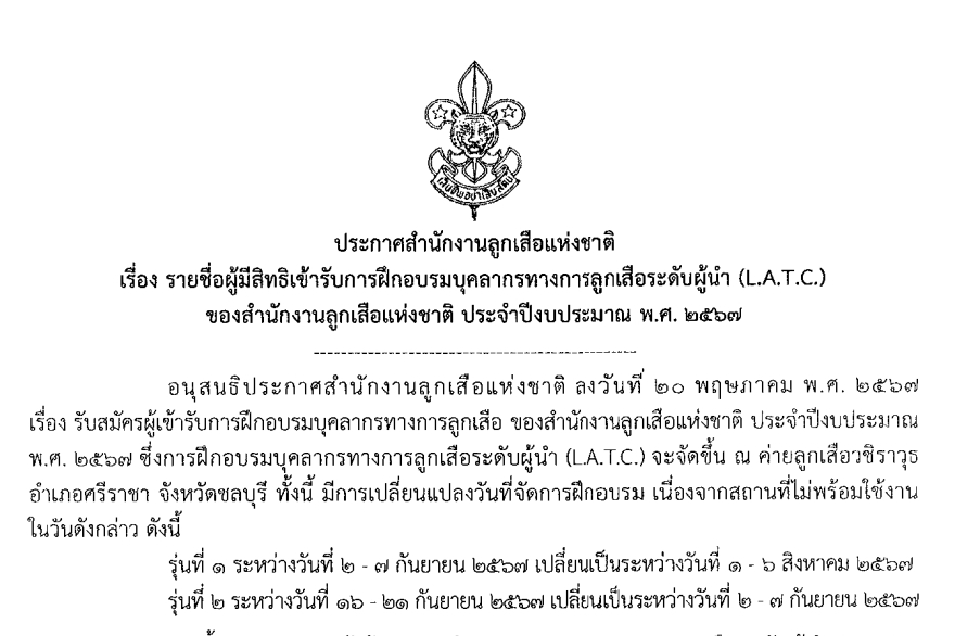 ตามที่สำนักงานลูกเสือแห่งชาติ ได้ประกาศรับสมัครผู้เข้ารับการฝึกอบรมบุคลากรทางการลูกเสือระดับผู้นำ (L.A.T.C.) ประจำปีงบประมาณ พ.ศ. 2567 ระหว่างวันที่ 20-31 พฤษภาคม 2567 นั้น บัดนี้ การรับสมัครผู้เข้ารับการฝึกอบรมบุคลากรทางการลูกเสือระดับผู้นำ ได้สิ้นสุดแล้ว จึงประกาศรายชื่อผู้มีสิทธิเข้ารับการฝึกอบรมฯ ดังนี้