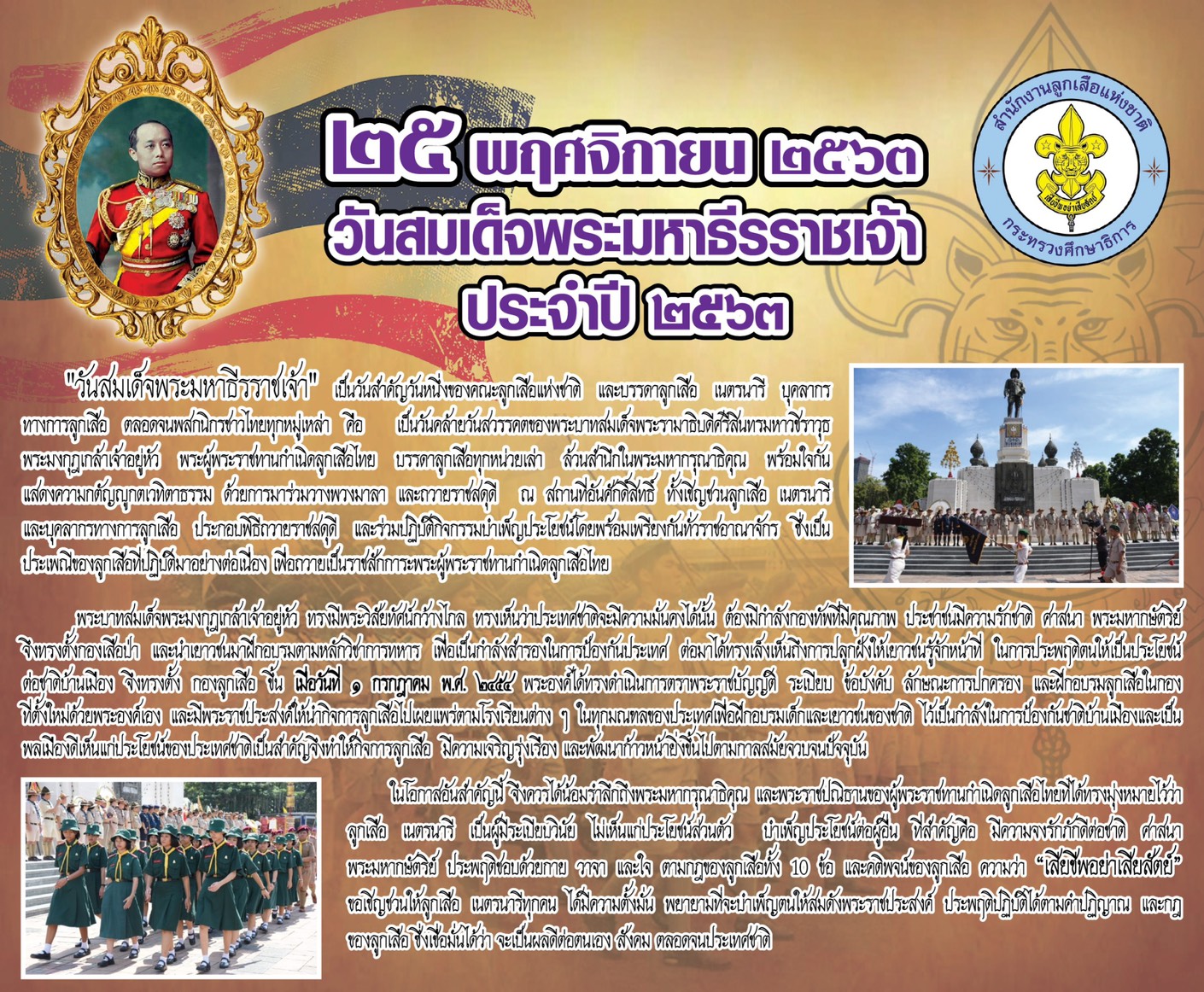 พระบาทสมเด็จพระมงกุฎเกล้าเจ้าอยู่หัว ทรงมีพระวิสัยทัศน์กว้างไกล ทรงเห็นว่าประเทศชาติจะมีความมั่นคงได้นั้น ต้องมีกำลังกองทัพที่มีคุณภาพ ประชาชนมีความรักชาติ ศาสนา พระมหากษัตริย์ จึงทรงตั้งกองเสือป่า และนำเยาวชนมาฝึกอบรมตามหลักวิชาการทหาร เพื่อเป็นกำลังสำรองในการป้องกันประเทศ ต่อมาได้ทรงเล็งเห็นถึงการปลูกฝังให้เยาวชนรู้จักหน้าที่ ในการประพฤติตนให้เป็นประโยชน์ต่อชาติบ้านเมือง จึงทรงตั้ง กองลูกเสือ ขึ้น เมื่อวันที่ ๑ กรกฎาคม พ.ศ. ๒๔๕๔ พระองค์ได้ทรงดำเนินการตราพระราชบัญญัติ ระเบียบ ข้อบังคับ ลักษณะการปกครอง และฝึกอบรมลูกเสือในกองที่ตั้งใหม่ด้วยพระองค์เอง และมีพระราชประสงค์ให้นำกิจการลูกเสือไปเผยแพร่ตามโรงเรียนต่าง ๆ ในทุกมณฑลของประเทศเพื่อฝึกอบรมเด็กและเยาวชนของชาติ ไว้เป็นกำลังในการป้องกันชาติบ้านเมือและเป็นพลเมืองดีเห็นแก่ประโยชน์ของประเทศชาติเป็นสำคัญจึงทำให้กิจการลูกเสือ มีความเจริญรุ่งเรือง และพัฒนาก้าวหน้ายิ่งขึ้นไปตามกาลสมัยจวบจนปัจจุบัน
