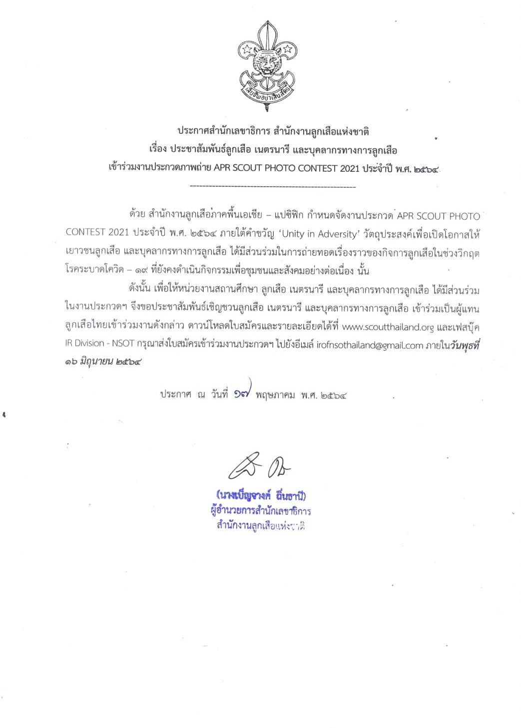 เชิญชวนลูกเสือเนตรนารี และบุคลากรทางการลูกเสือ เข้าร่วมประกวดภาพถ่าย APR Scout Photo Contest 2021 ภายใต้คำขวัญ Unity in Adversity วัตถุประสงค์ เพื่อเปิดโอกาสให้ได้มีส่วนร่วม ในการถ่ายทอดเรื่องราวของกิจการลูกเสือในช่วงวิกฤตโรคระบาดโควิด -19 ที่ยังคงกิจกรรมเพื่อสังคมอย่างต่อเนื่อง